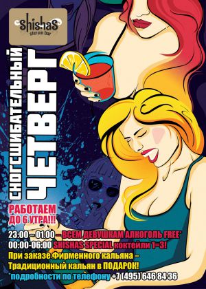 Только ЧЕТВЕРГ в Shushas на Новом Арбате имеет полное право называться СНОГШИБАТЕЛЬНЫМ, во всех смыслах этого слова! Заинтригованы? Сейчас мы расскажем Вам почему! :) Как известно, девушек много не бывает. Там где много девушек, много всего – танцев, внимания, любви, вкусностей, шампанского и коктейлей. Особенно много самых красивых, загорелых, соблазнительных, изящных и грациозных девушек приходит в гости к нам, в Shushas на Новом Арбате! А чтобы им было еще веселее, по ЧЕТВЕРГАМ мы решили не скупиться!