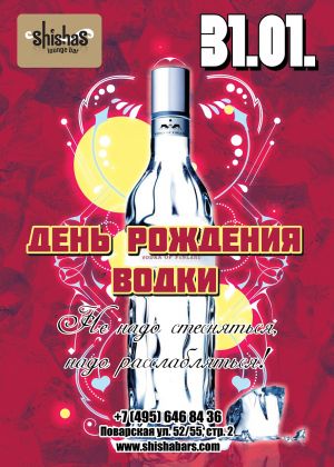ПЯТНИЦА – 31 ЯНВАРЯ 2014 – DRINK DRINK ALCOHOL в Shishas Lounge Bar! День рождения водки! Не надо стесняться, надо расслабляться!
